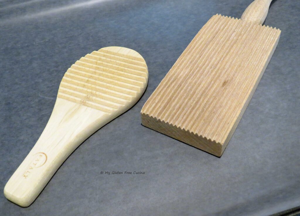 Malloreddus pasta is a type of gnocchi originating in Sardinia, Italy. There are a few things that distinguish this regional pasta from other types of gnocchi. First, look at the ridges on the Malloreddus paddle on the left, vs. a typical gnocchi paddle on the right. The ridges are wider and deeper on the Malloreddus paddle, to create the distinctive grooves. They really soak up the sauce!