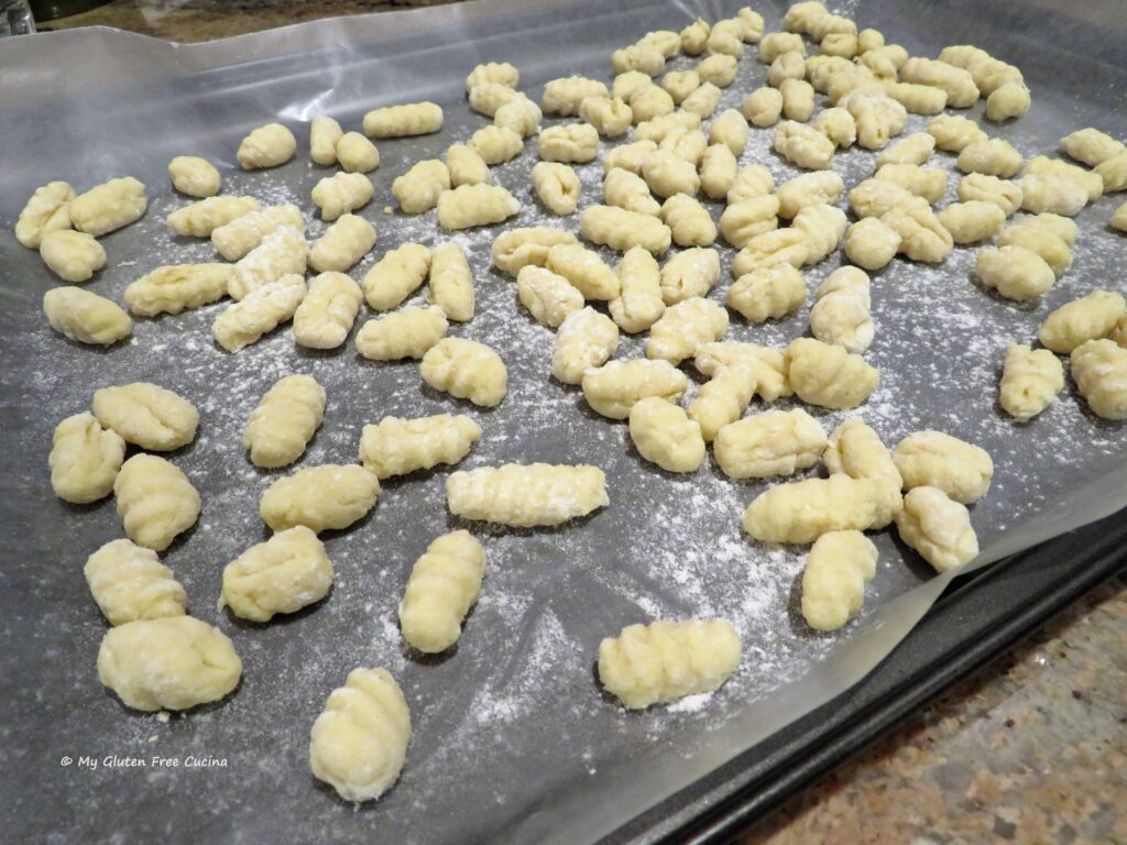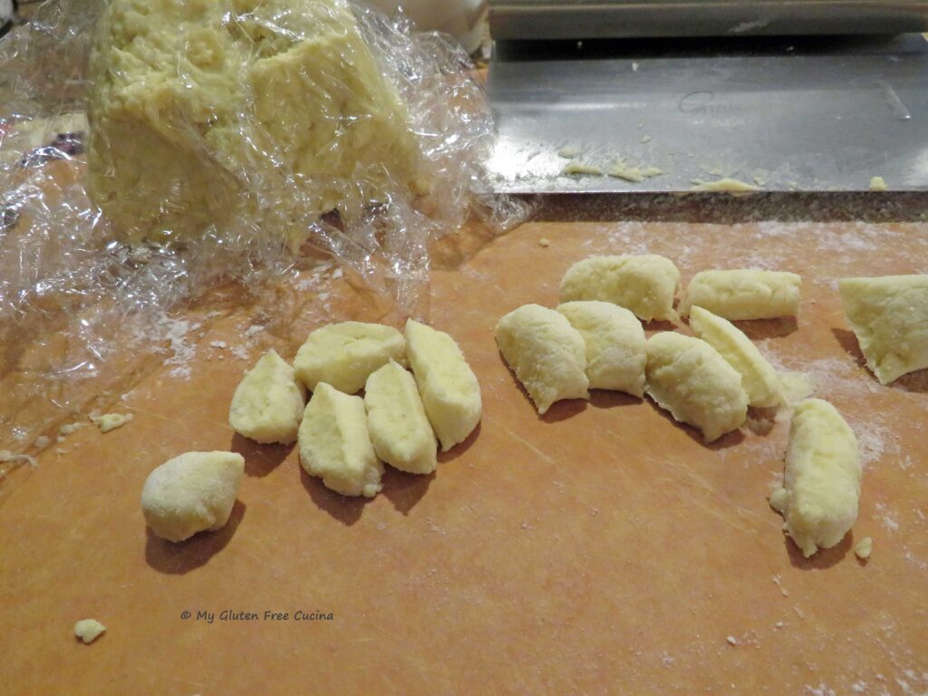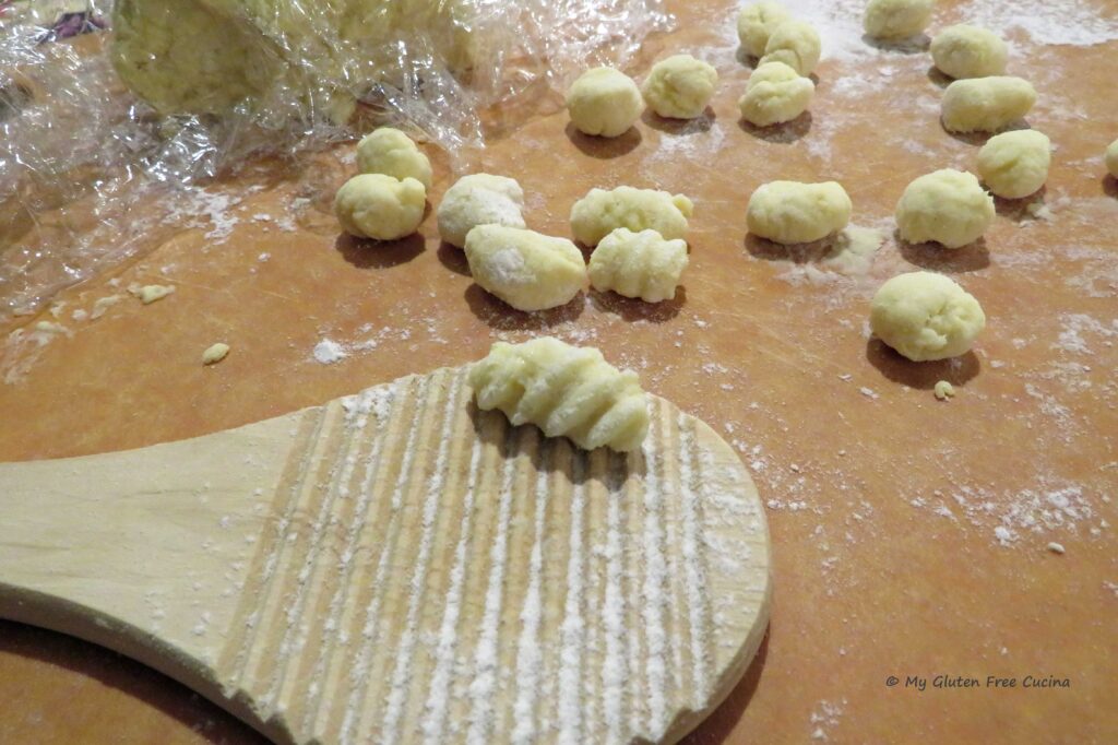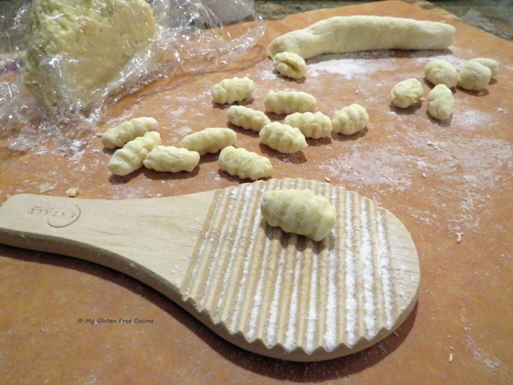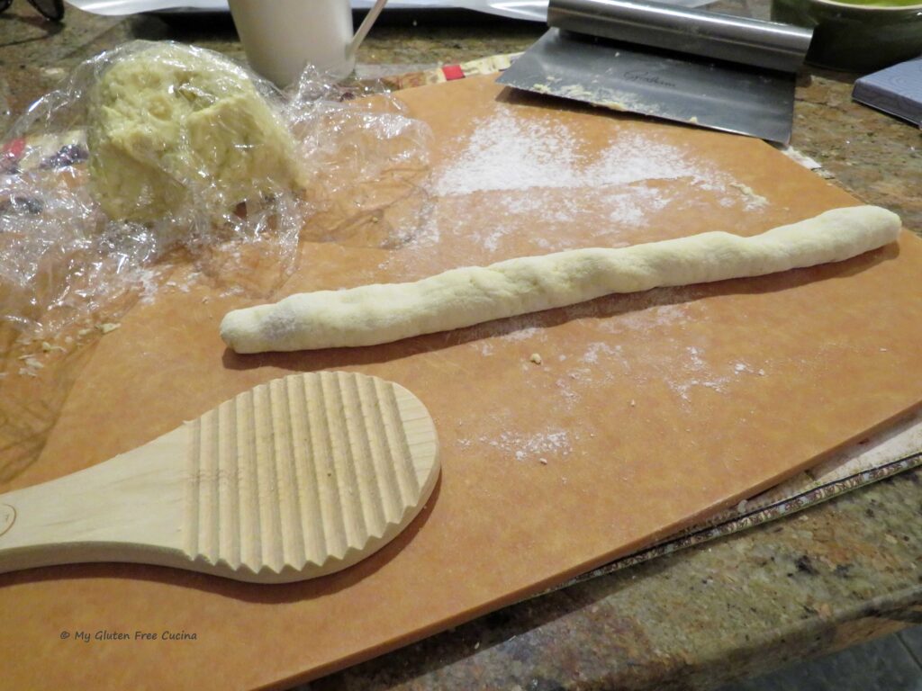Malloreddus pasta is traditionally made with semolina flour and water. Of course, semolina is off limits on the gluten free diet, so for my gluten free adaptation, I used the new Gluten Free Bread Flour from Better Batter. You can try this recipe with any one-to-one gluten free all-purpose blend. I added water, salt and just a bit of olive oil, to help the dough come together.