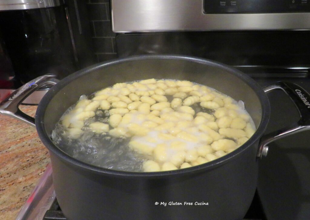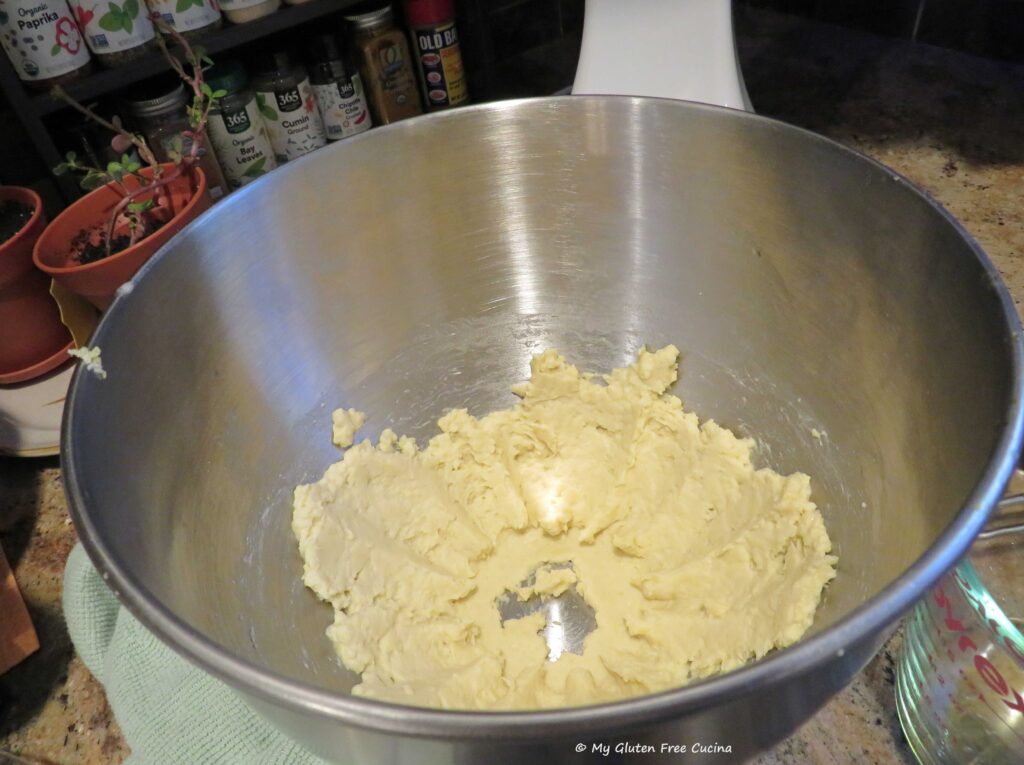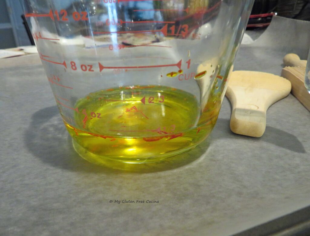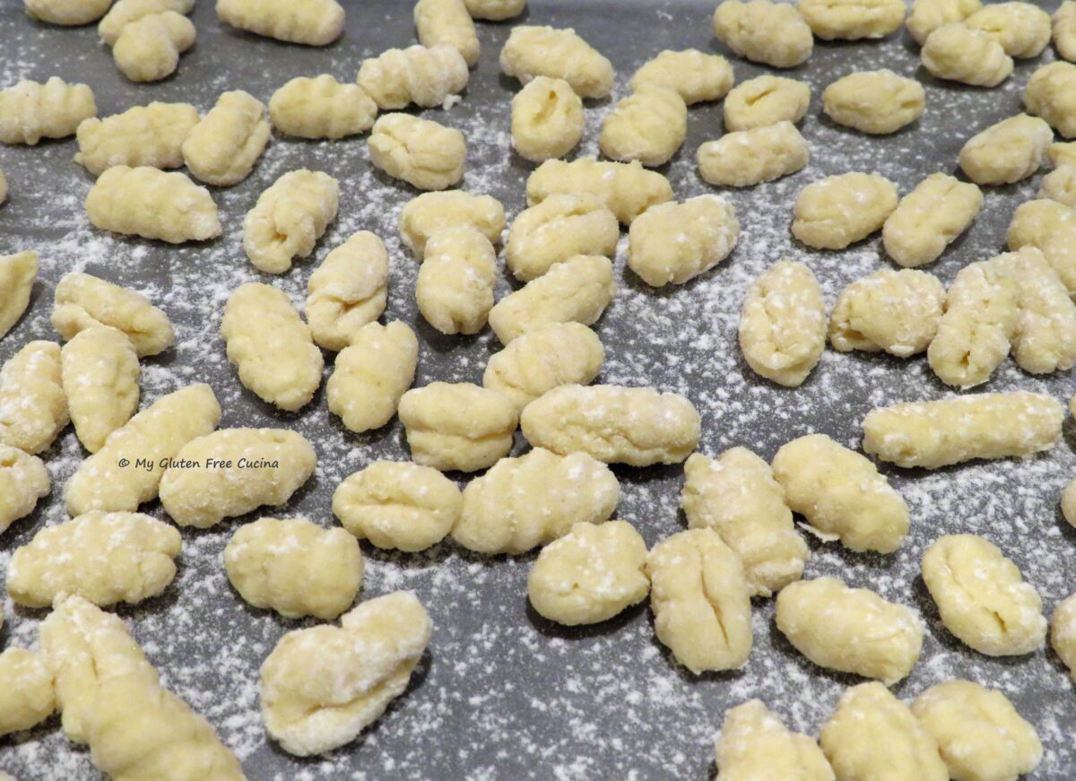 Malloreddus pasta is traditionally made with semolina flour and water. Of course, semolina is off limits on the gluten free diet, so for my gluten free adaptation, I used the new Gluten Free Bread Flour from Better Batter. You can try this recipe with any one-to-one gluten free all-purpose blend. I added water, salt and just a bit of olive oil, to help the dough come together.