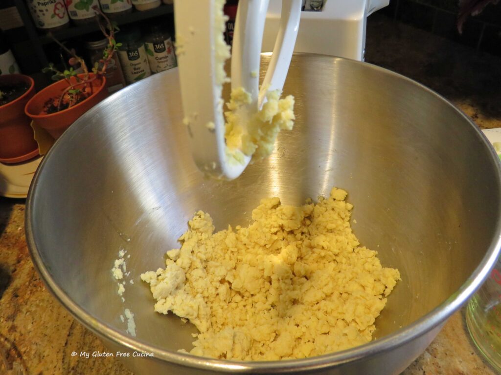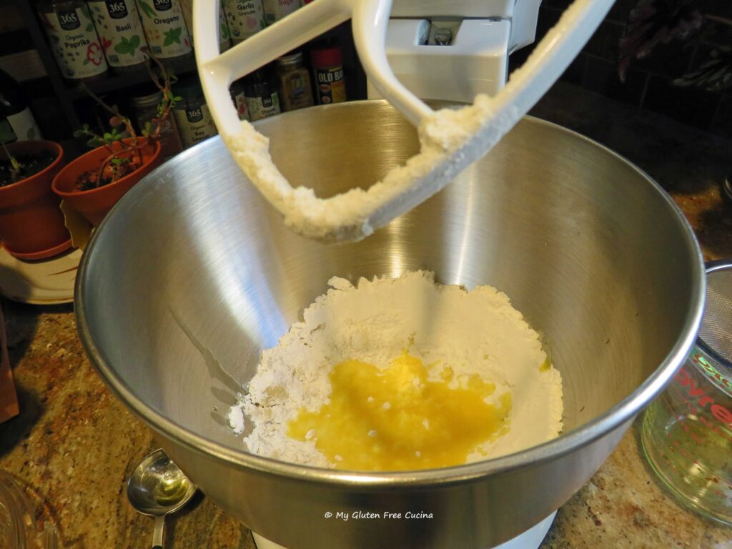 Drizzle in the olive oil and mix on low speed with the paddle attachment. You may need up to 1/4 cup of additional water to achieve the right consistency. If the dough looks crumbly like this, it is too dry.