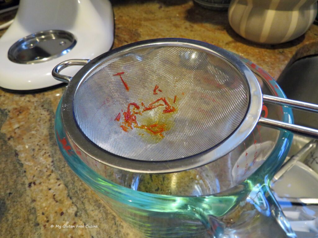 Hint– If you need to add the additional water, pour it over the strained saffron threads so you get more of the coloring.