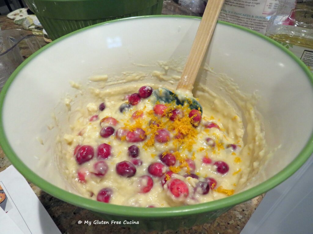 Stir the dry ingredients into the wet. Toss the cranberries with 1 tbsp. flour and add to the batter along with the orange zest.