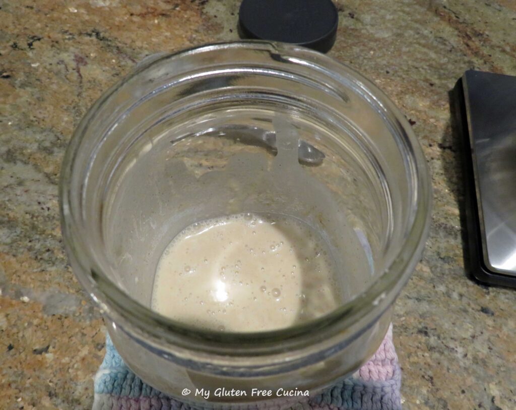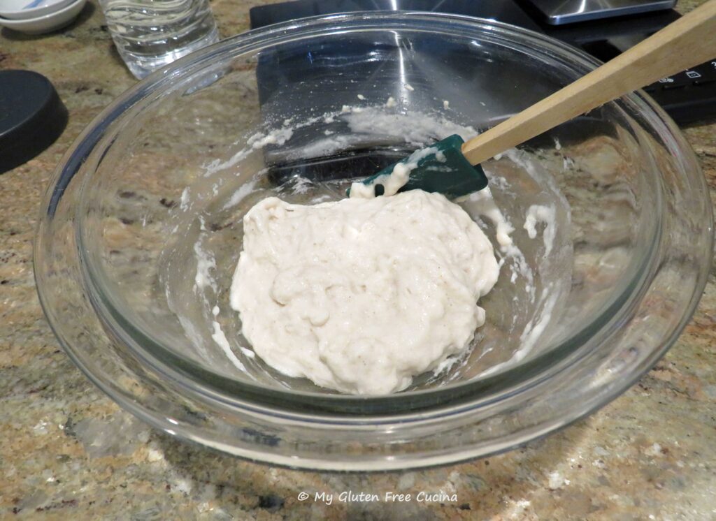 Morning – Stir together the preferment ingredients, cover with plastic wrap and let sit in a warm place for at least 7 hours (I used my proofing box).  As the day goes on, it will become increasingly puffy and smooth.