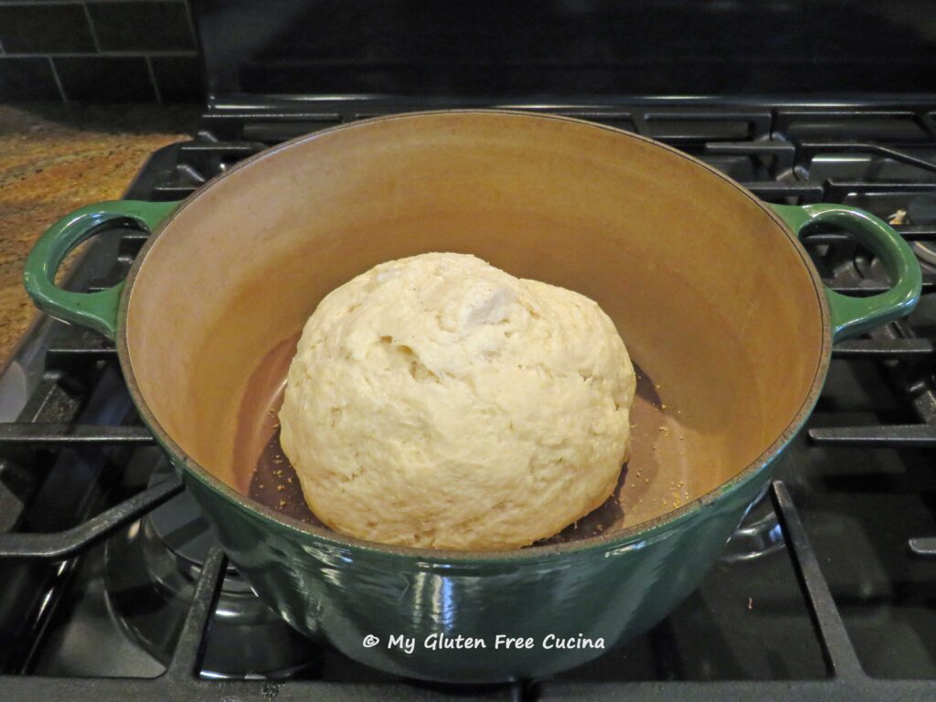 Morning – Take the dough out of the refrigerator and let it stand at room temperature while you preheat the oven to 475º.  Place a Dutch oven on the middle shelf while the oven is heating for 1/2 hour prior to baking (note- if you are not using cast iron be careful, read the instructions for your pot to make certain it can withstand being heated while empty).