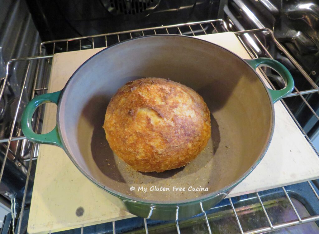 Reduce the oven temperature to 450º and bake for 30 minutes.  Then remove the cover and continue baking another 20 minutes.  Loaf is done when the internal temperature reaches 210º (check with a thermometer).
