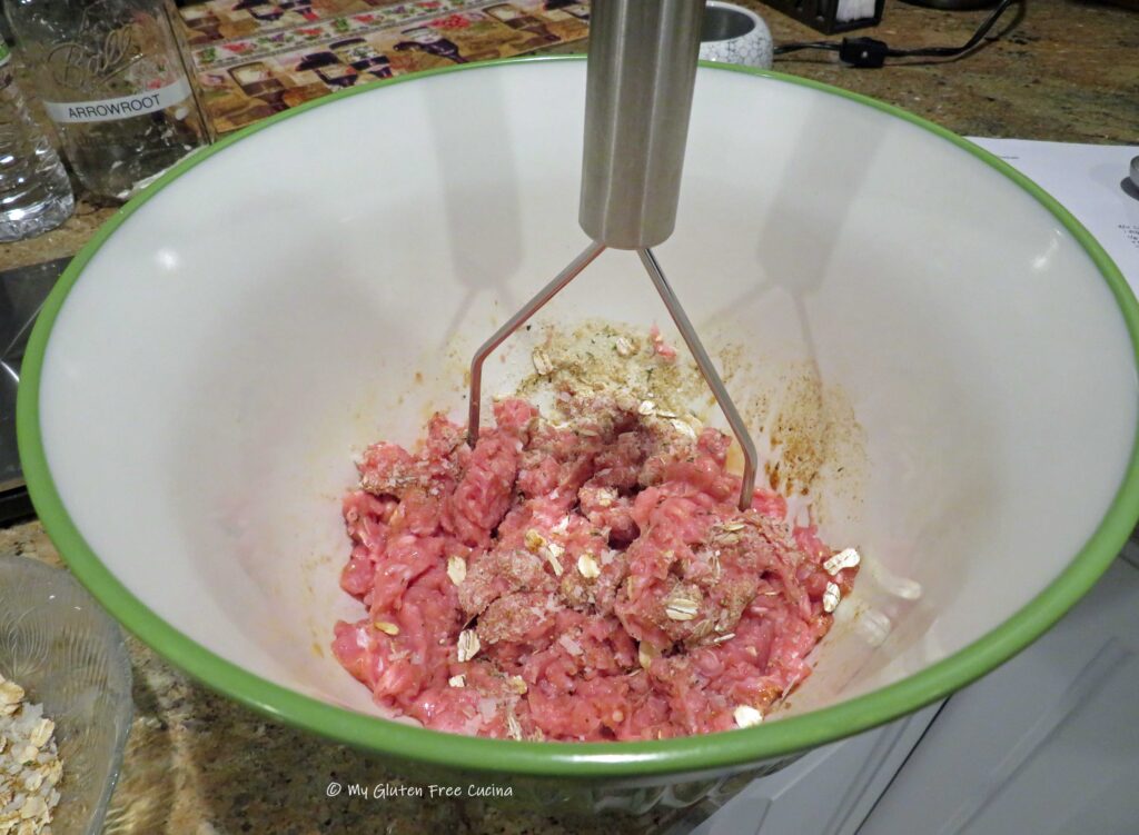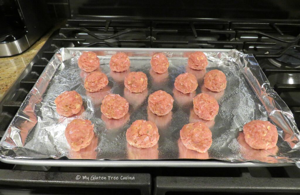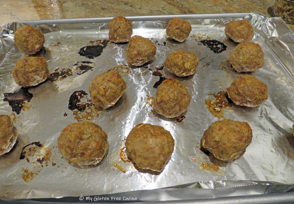 Combine all of the ingredients in a bowl and mix thoroughly with your hands or a potato masher. Line a sheet pan with foil and mist with cooking spray. Form 16 small meatballs and arrange in the pan with space in between. Broil 4-5 minutes per side.