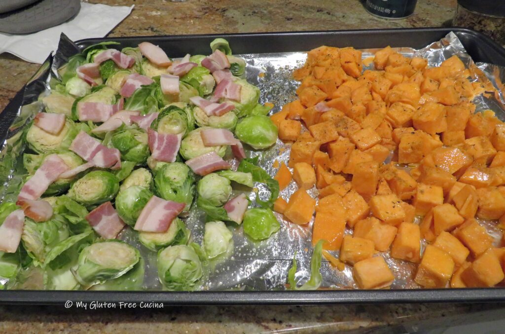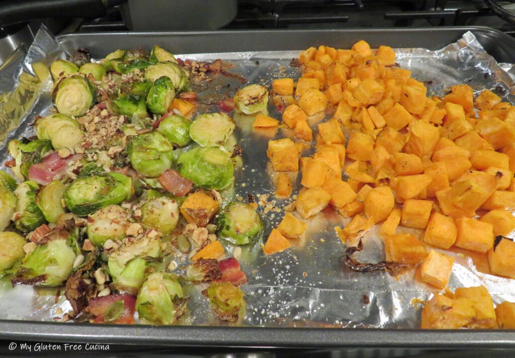 Notes ♪♫ Many supermarkets offer fresh veggies that have been prepped for cooking. I got sweet potato peeled and diced, and Brussels sprouts that were pre-washed and halved. Such a convenience, I just had to spread them out on a baking sheet and add my toppings!