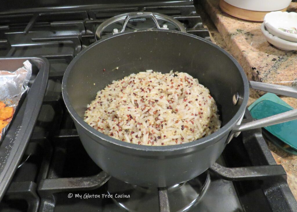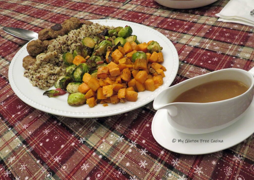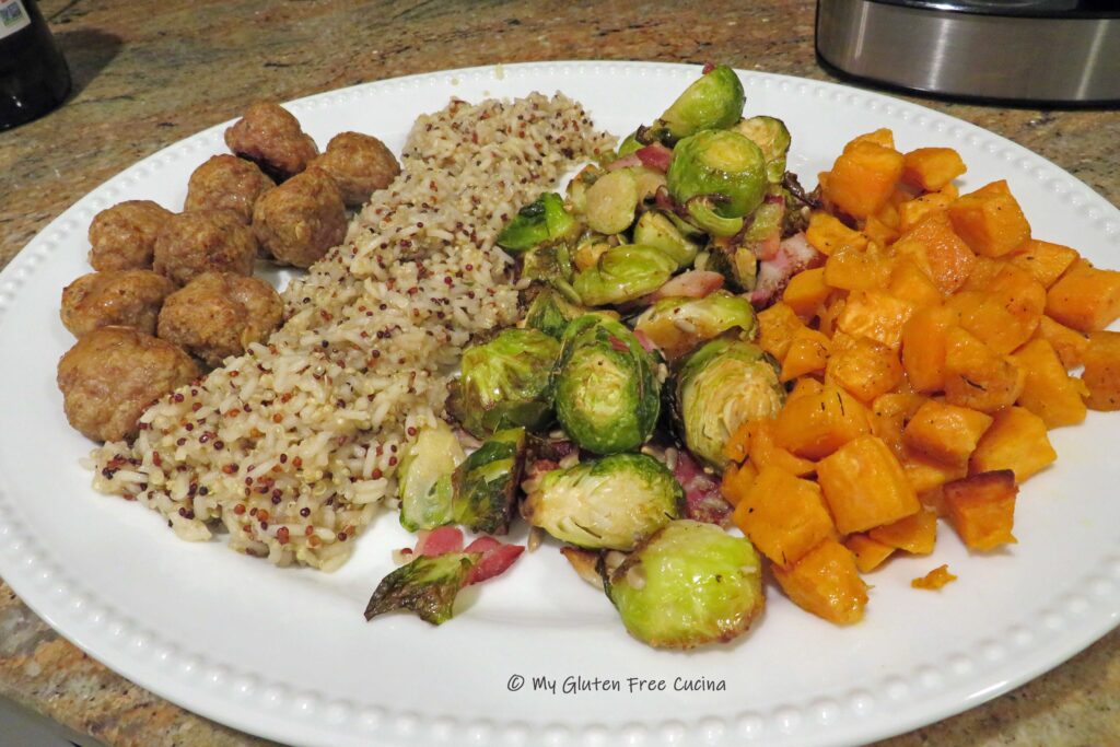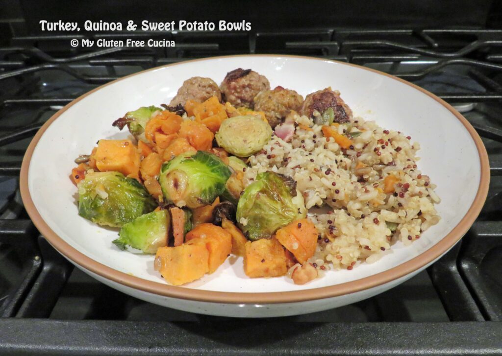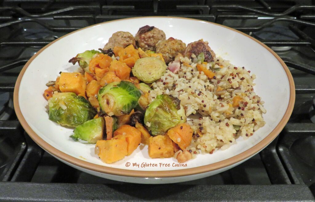 This bowl has sweet potato, Brussels sprouts, turkey meatballs, and a rice-quinoa pilaf. For texture and crunch, I added bacon, nuts and seeds. Finished with a drizzle of gravy to bring it all together. Let’s take it one step at a time.
