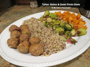 This bowl has sweet potato, Brussels sprouts, turkey meatballs, and a rice-quinoa pilaf. For texture and crunch, I added bacon, nuts and seeds. Finished with a drizzle of gravy to bring it all together. Let’s take it one step at a time.